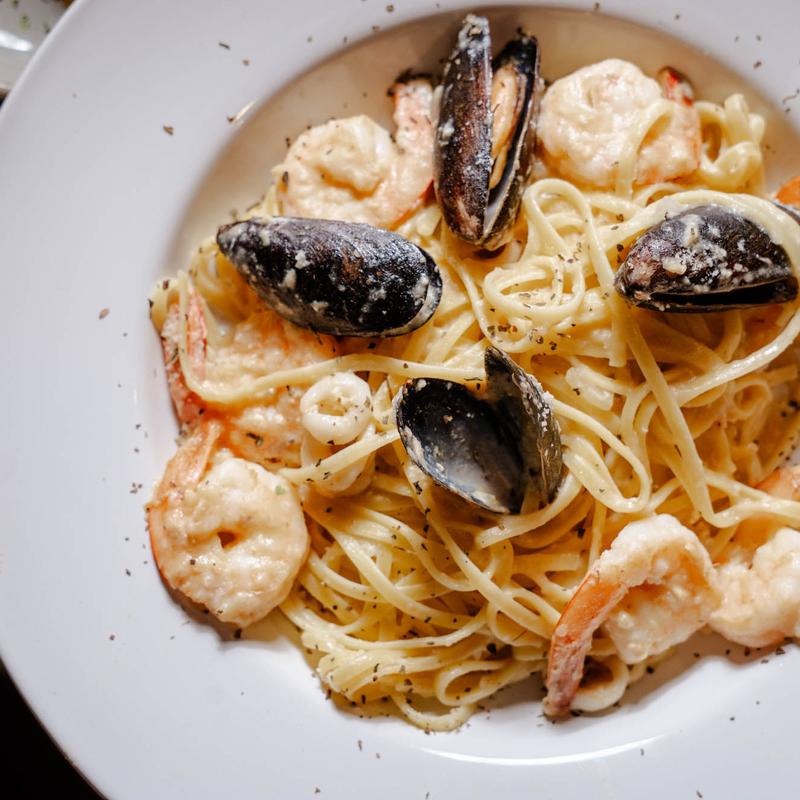 Linguine, cream cheese, fish, seafood mix, parmesan cheese