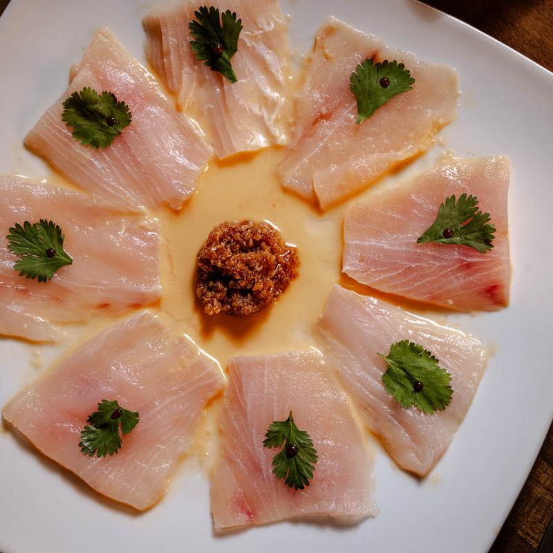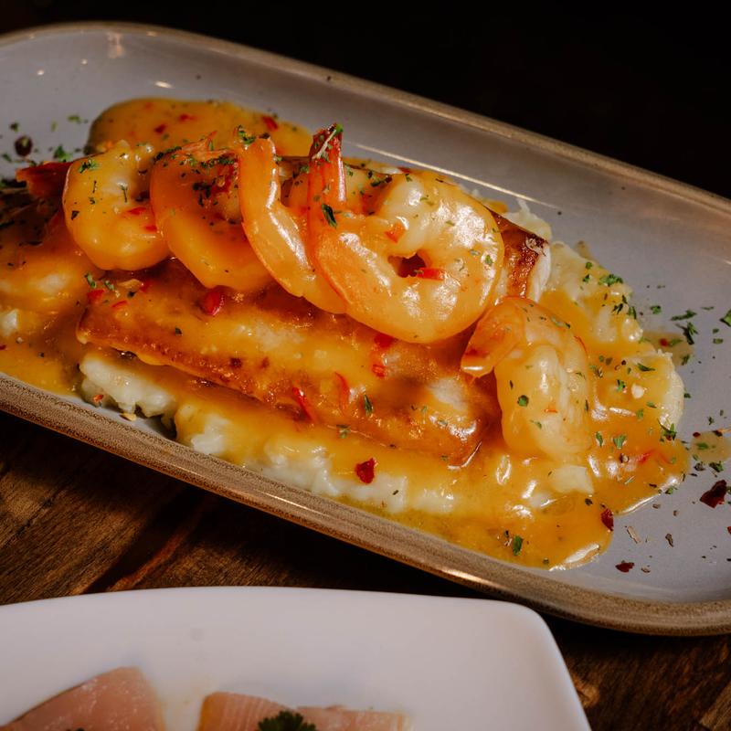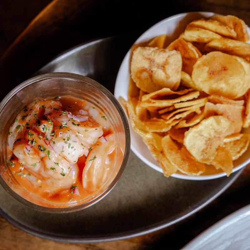 Shrimp, avocado, red onion, cilantro, jalapeno, lime