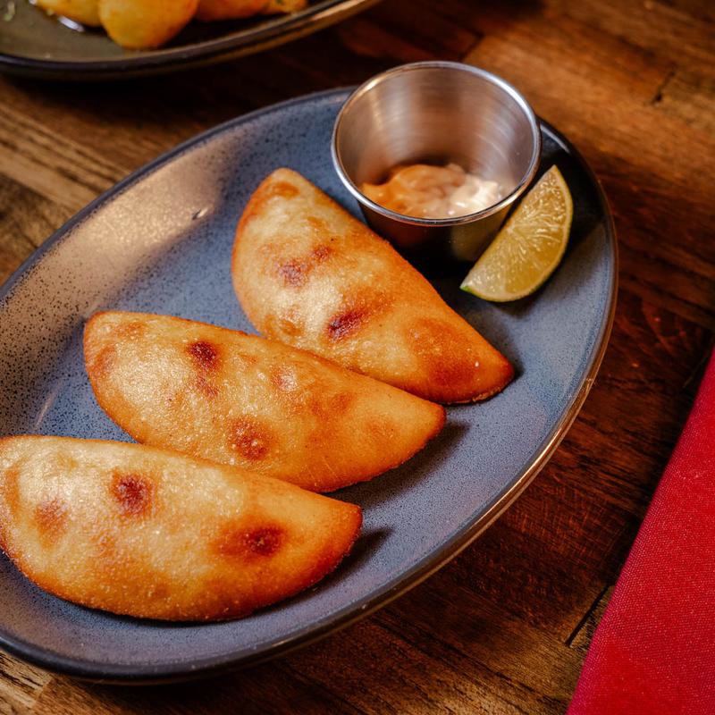 Shrimp, ketchup, mustard, red onion, cilantro, plantain