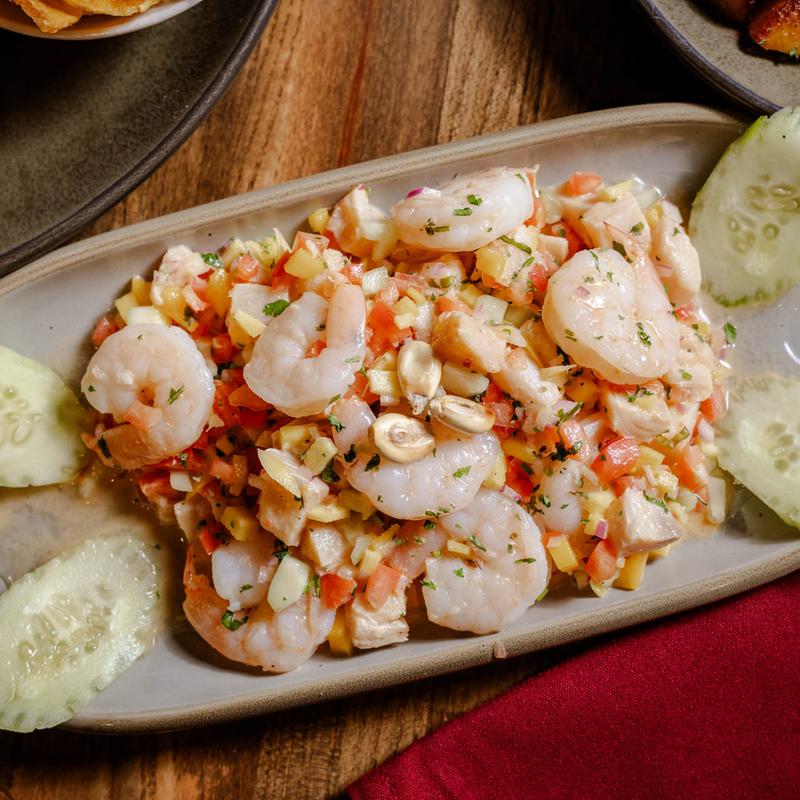Shrimp, tomato, red onion, cucumber, mango, cilantro, lime